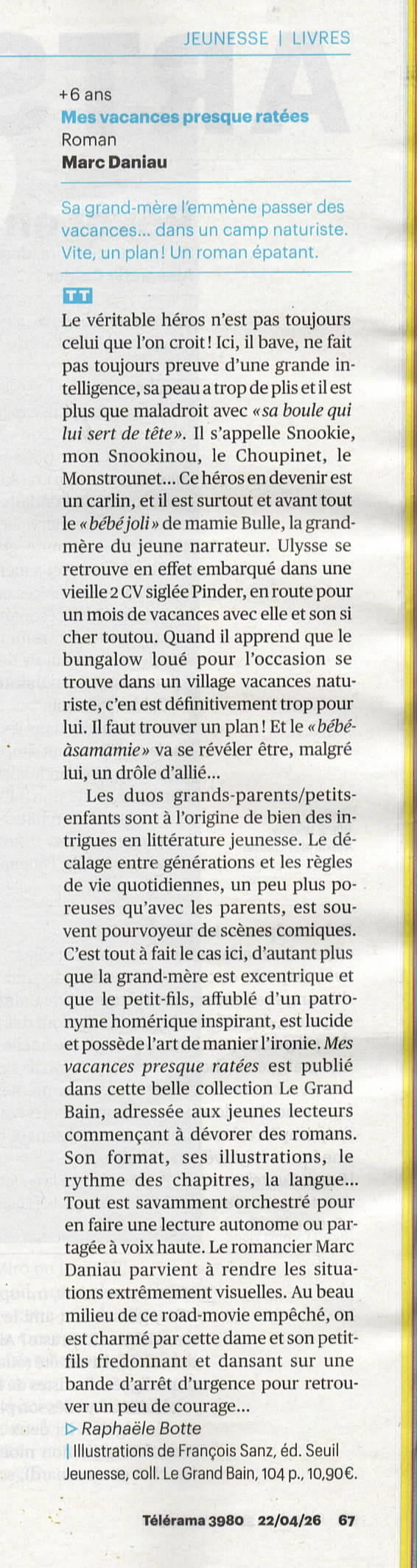 À peine sortie dans la choupinette collection » le grand bain » au Seuil Jeunesse, mon roman illustré par le camarade François Sanz est déjà chroniqué dans Télérama.