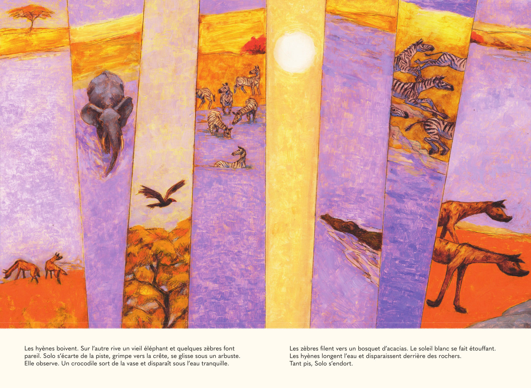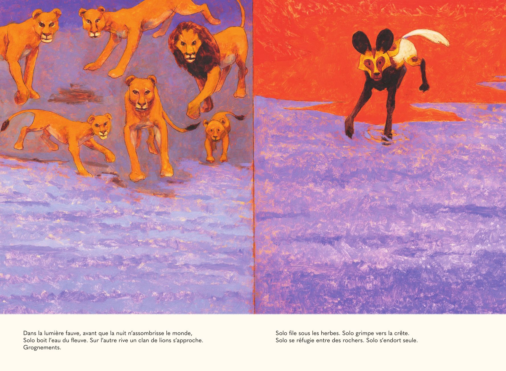 Solo, inspiré d’une histoire vraie, ce récit interroge particulièrement. En se penchant sur cette femelle lycaon solitaire qui va intégrer peu à peu une famille de chacals, l’album Solo, est une ode à l’altérité, la tolérance (Thierry Magnier 2024)